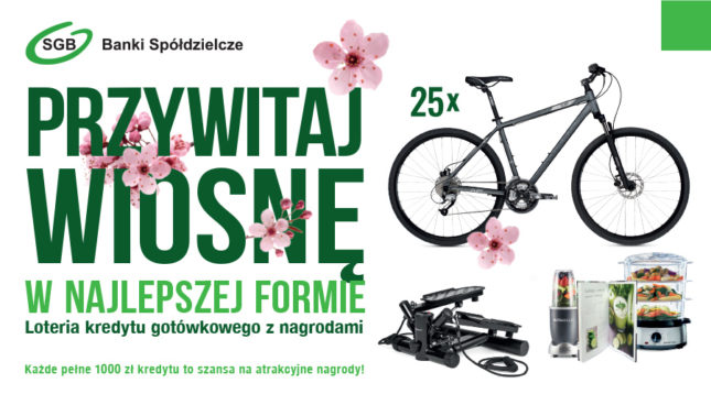 Wystartowała wiosenna edycja loterii kredytów gotówkowych. Promocja trwa od 12.03.2018 r. do 27.04.2018 r. Każde 1000 zł kredytu to jeden udział w losowaniu i szansa na zdobycie wyjątkowych nagród. Przywitaj wiosnę w najlepszej formie!