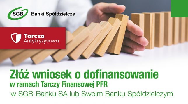 Jesteś przedsiębiorcą? Zatrudniasz pracowników? Obawiasz się o swoją działalność ze względu na panującą epidemię koronawirusa? 28 kwietnia 2020 roku Banki Spółdzielcze SGB i SGB-Bank SA umożliwią dodatkowe finansowanie przedsiębiorstw w ramach rządowego programu wsparcia dla mikro, małych i średnich podmiotów gospodarczych. Dzięki programowi Tarczy Finansowej realizowanemu przez Polski Fundusz Rozwoju, do najbardziej zagrożonych przedsiębiorstw trafi aż 75 miliardów złotych.