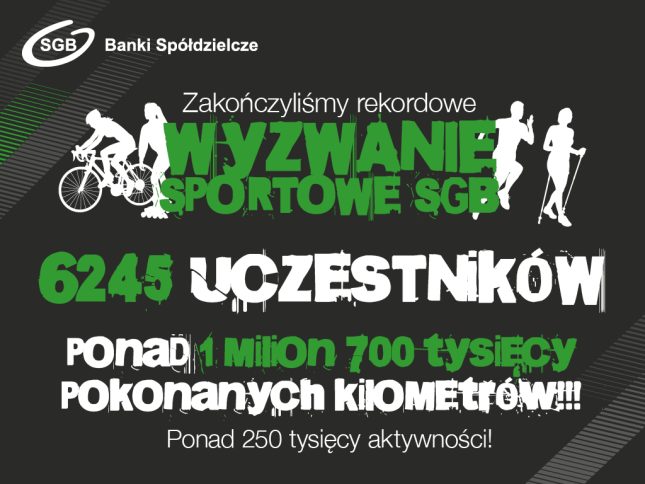 Ponad 6200 sympatyków i pracowników SGB pokonało wspólnie ponad 1 milion 700 tysięcy kilometrów! Przez 44 dni trwania konkursu, zbieraliśmy kilometry biegając, chodząc, jeżdżąc na rowerach i rolkach. Wykonaliśmy wspólnie ponad 250 tysięcy aktywności!